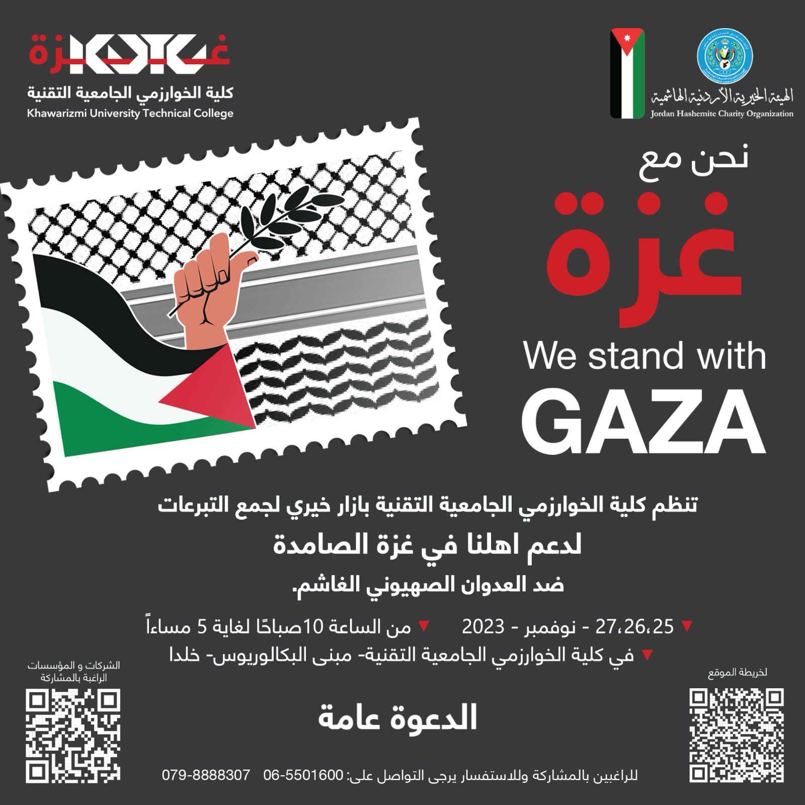 تنظم كلية الخوارزمي الجامعية التقنية بالتعاون مع الهيئة الخيرية الأردنية الهاشمية بازارا خيريا بعنوان "نحن مع غزة" بعد غد السبت ولمدة ثلاثة أيام من العاشرة صباحا وحتى الخامسة مساءً.