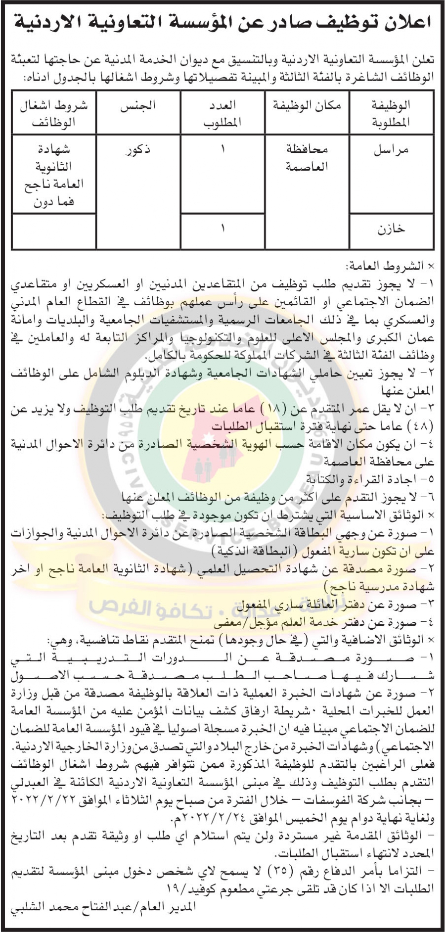 إعلان توظيف صادر عن المؤسسة التعاونية الأردنية