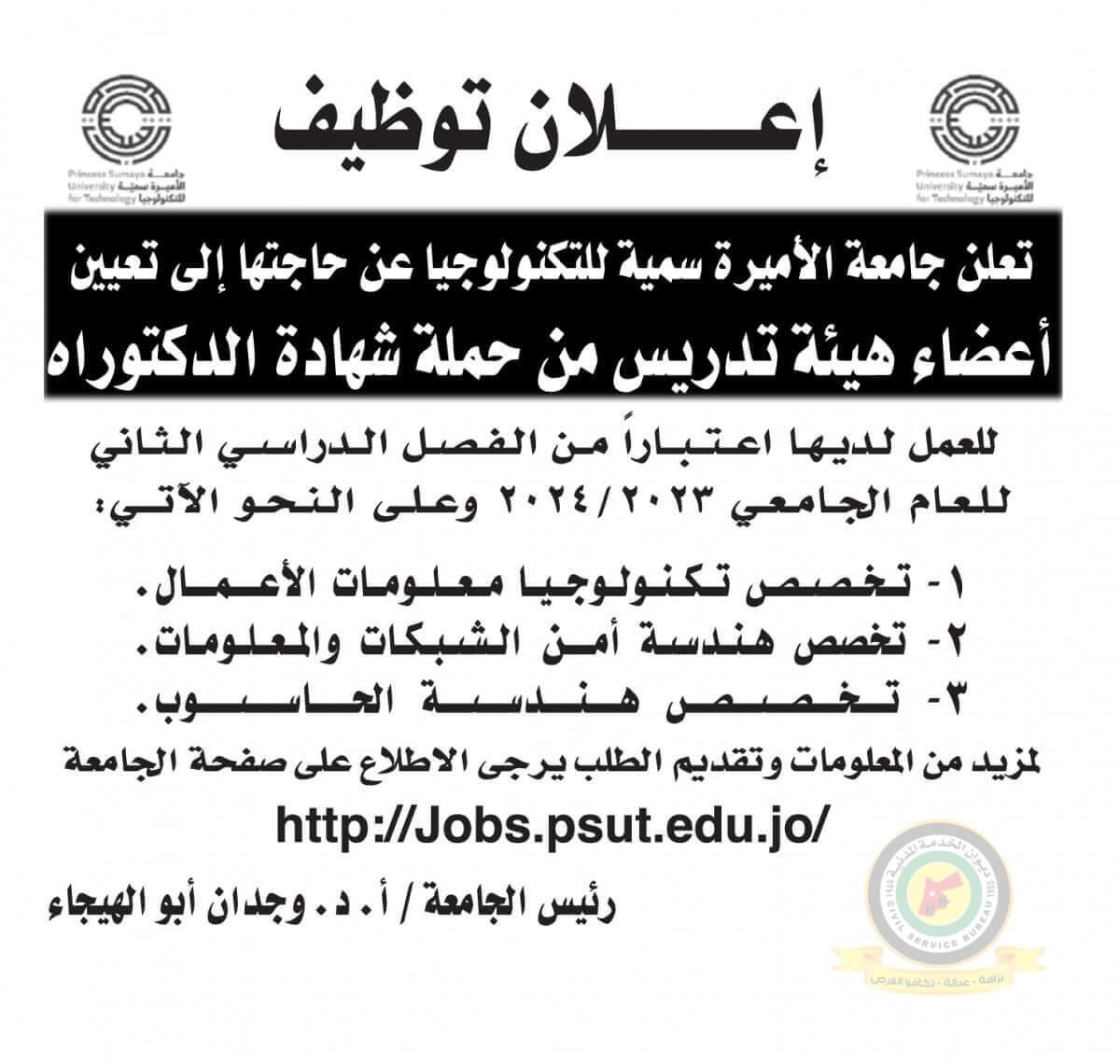 اعلان تعيين اعضاء هيئة تدريسية صادرعن جامعة الأميرة سمية للتكنولوجيا