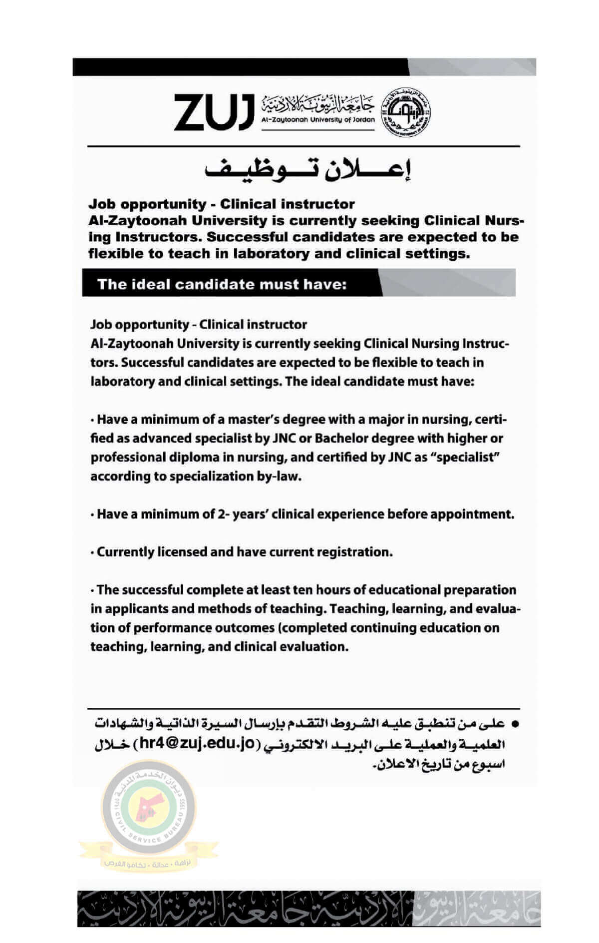 اعلان وظائف شاغرة مشرفين مختبر صادرعن جامعة الزيتونة الأردنية