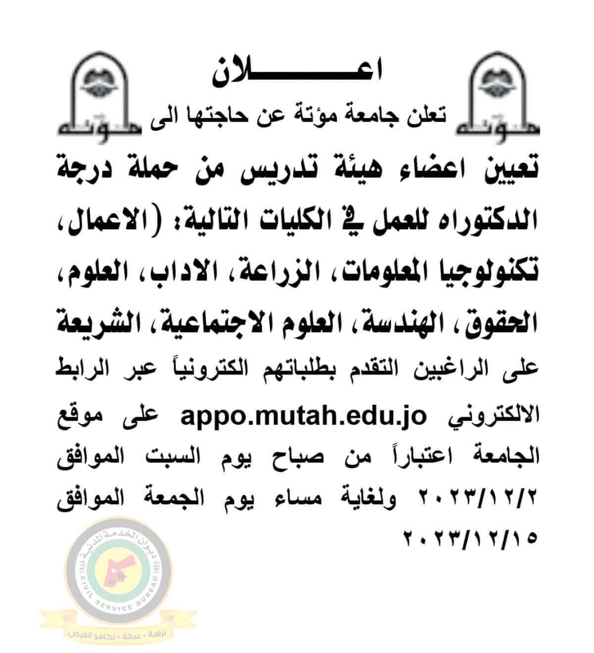 اعلان تعيين اعضاء هيئة تدريسية صادرعن جامعة مؤتة
