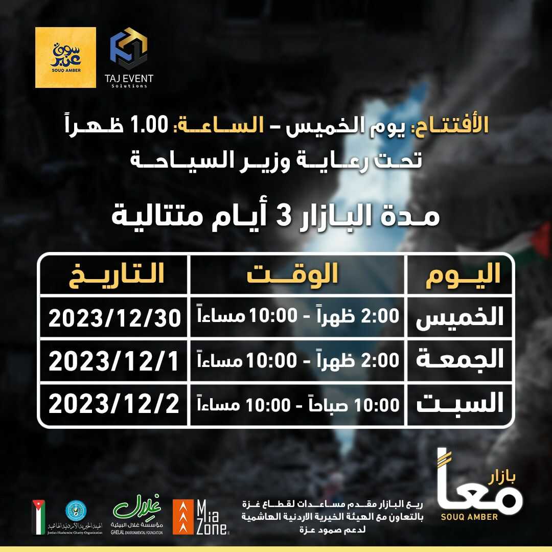 يشارك في البازار مجموعة من الحرفين بالاشغال اليدوية و بعض المطابخ الانتاجية بمنتجاتهم الذين تبرعوا بمبلغ مشاركتهم لصندوق الهيئة الاردنية الهاشمية كدعم منهم لصمود اهالي غزة.