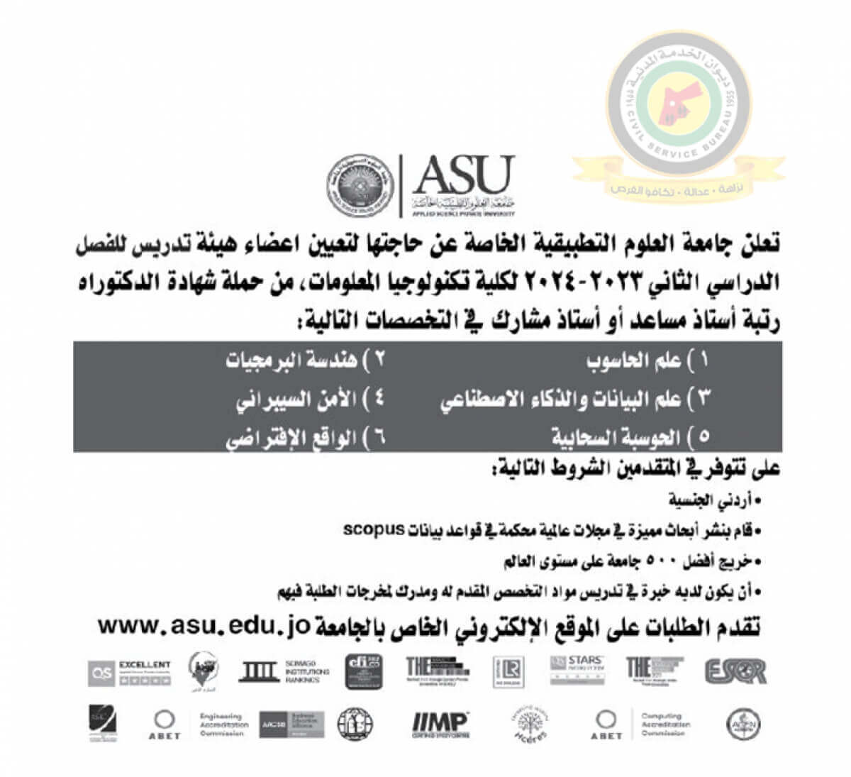 اعلان تعيين اعضاء هيئة تدريسية صادرعن جامعة العلوم التطبيقية الخاصة