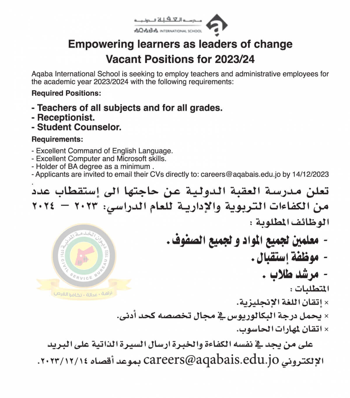 اعلان وظائف شاغرة صادرعن مدرسة العقبة الدولية