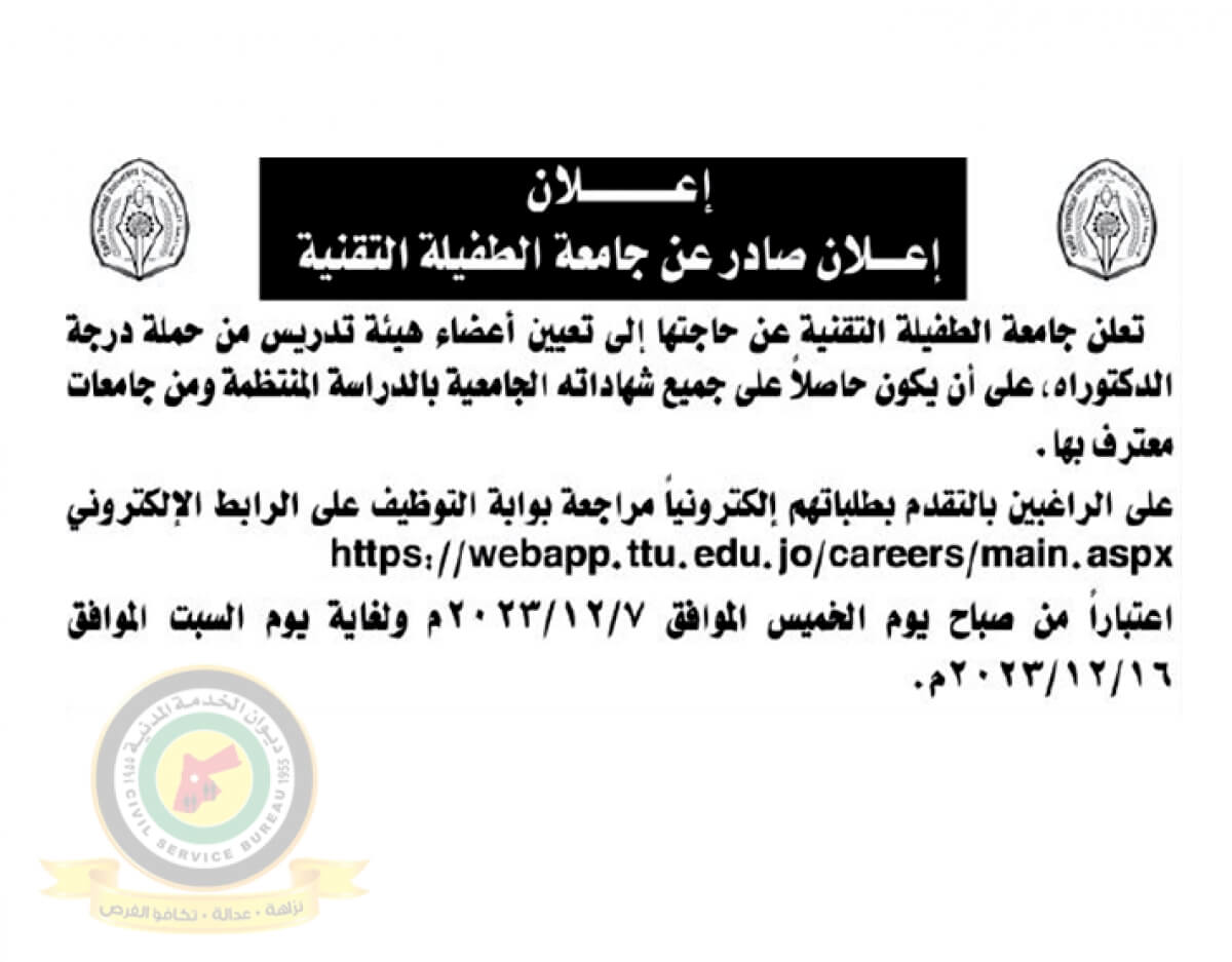اعلان تعيين اعضاء هيئة تدريسية صادرعن جامعة الطفيلة التقنية