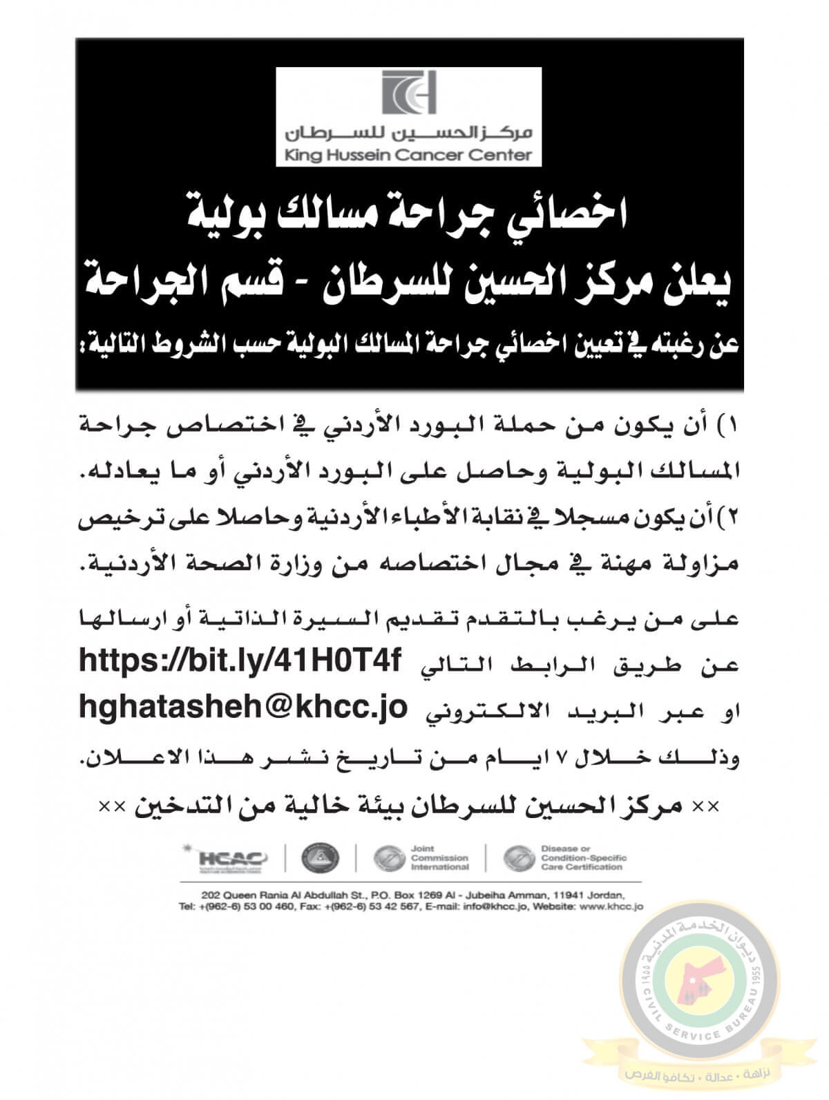 اعلان وظائف شاغرة طبيب اخصائي جراحة مسالك بولية صادرعن مركز الحسين للسرطان