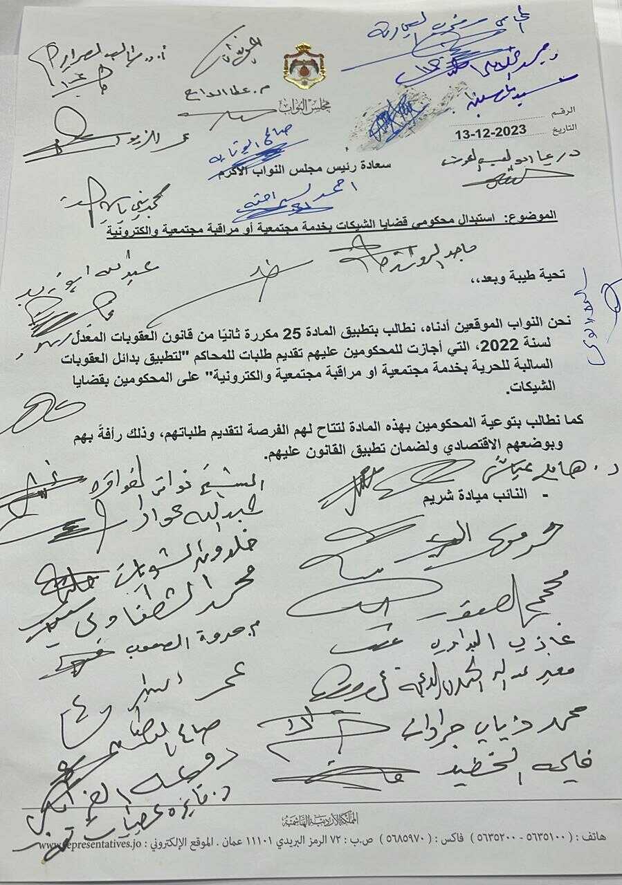 لسنة ،2022 التي أجازت للمحكومين عليهم تقديم طلبات للمحاكم "لتطبيق بدائل العقوبات السالبة للحرية بخدمة مجتمعية او مراقبة مجتمعية والكترونية" على المحكومين بقضايا الشيكات.