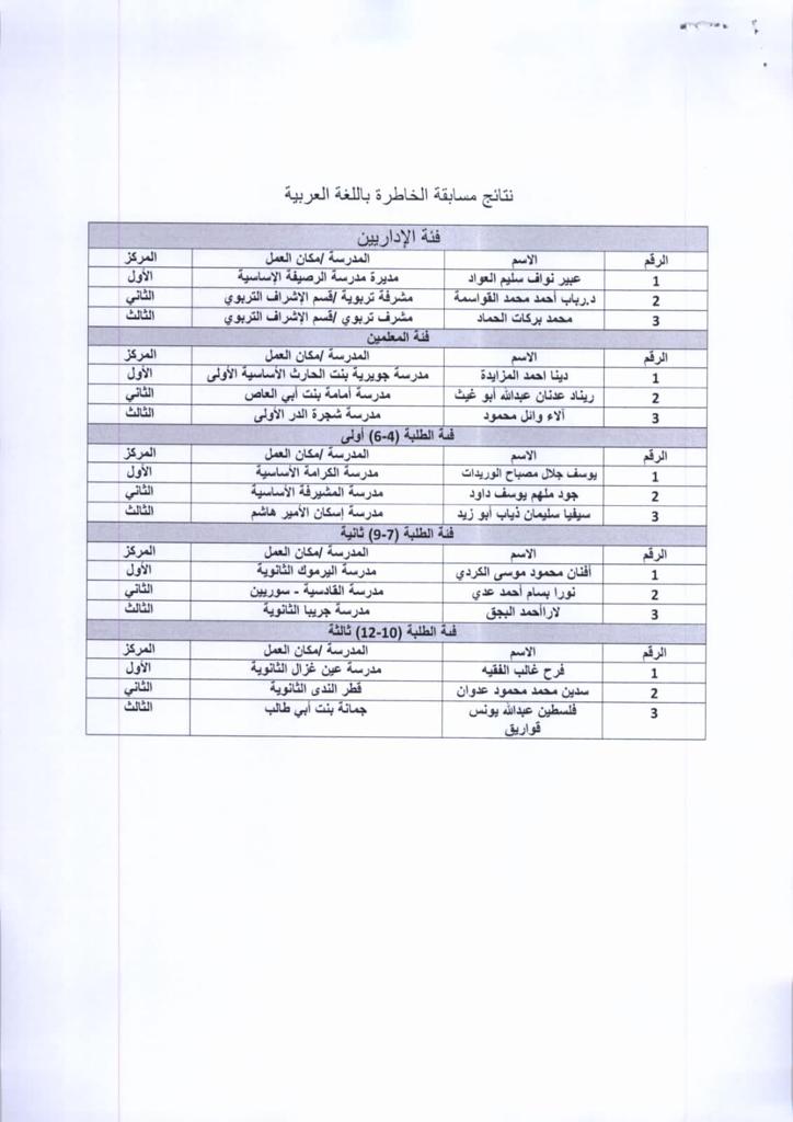 وكرّمت الدكتورة طيفور "الخاطرة الفائزة" كما كرّمت 15 فائزا من فئة الإداريين والمعلمين كما تم تكريم فئة الطلبة حسب الصفوف وحسب الكشف المدرج بالصور.