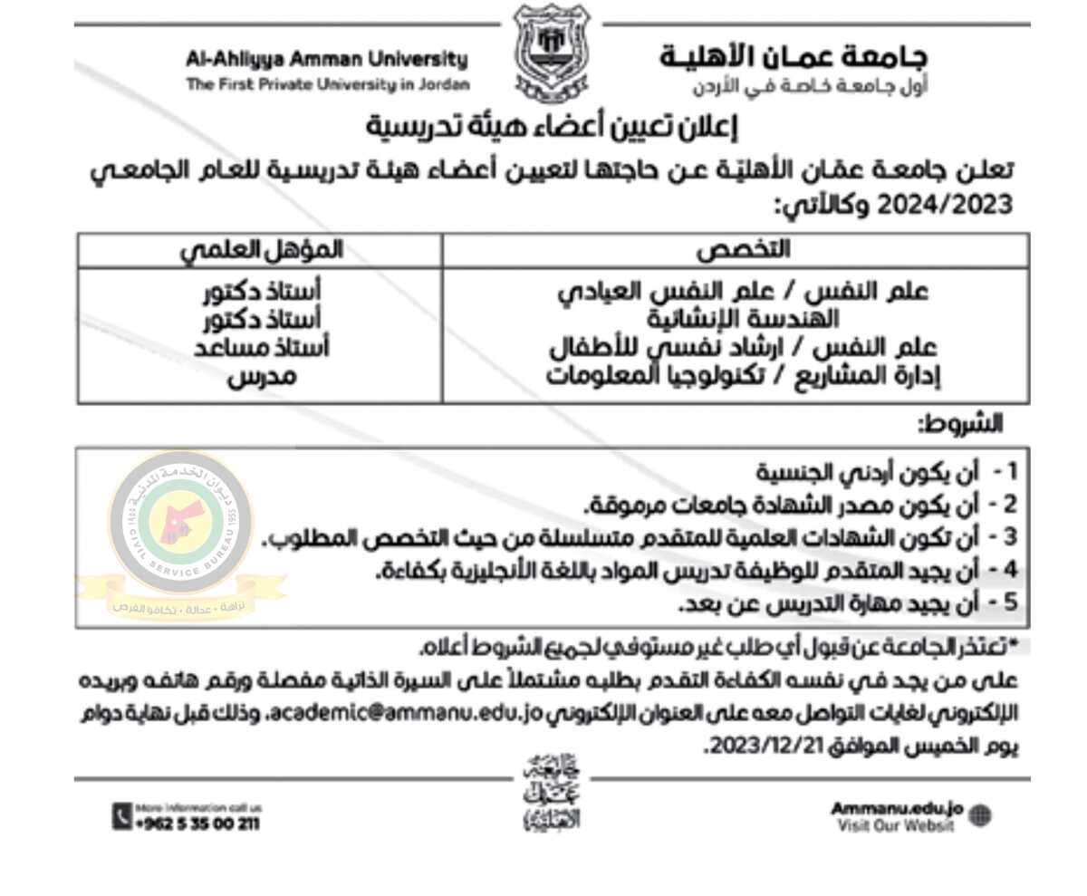 اعلان تعيين اعضاء هيئة تدريسية صادرعن جامعة عمان الأهلية