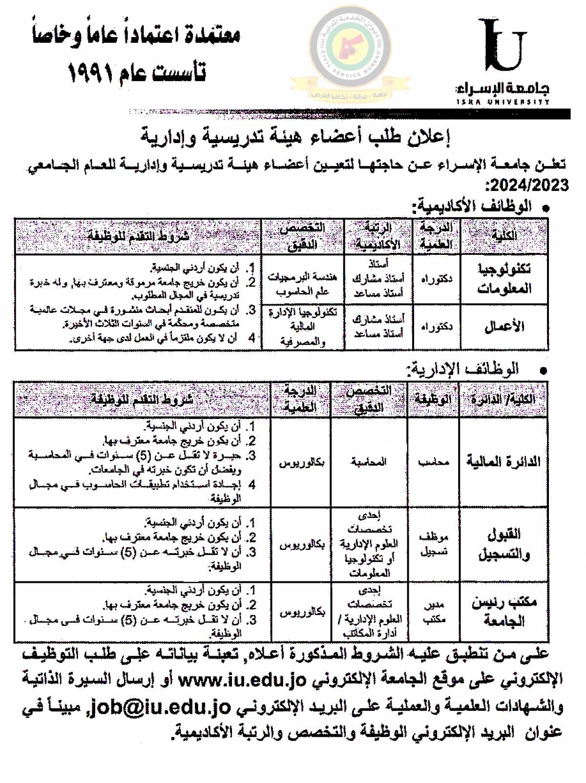 اعلان تعيين اعضاء هيئة تدريسية صادرعن جامعة الإسراء