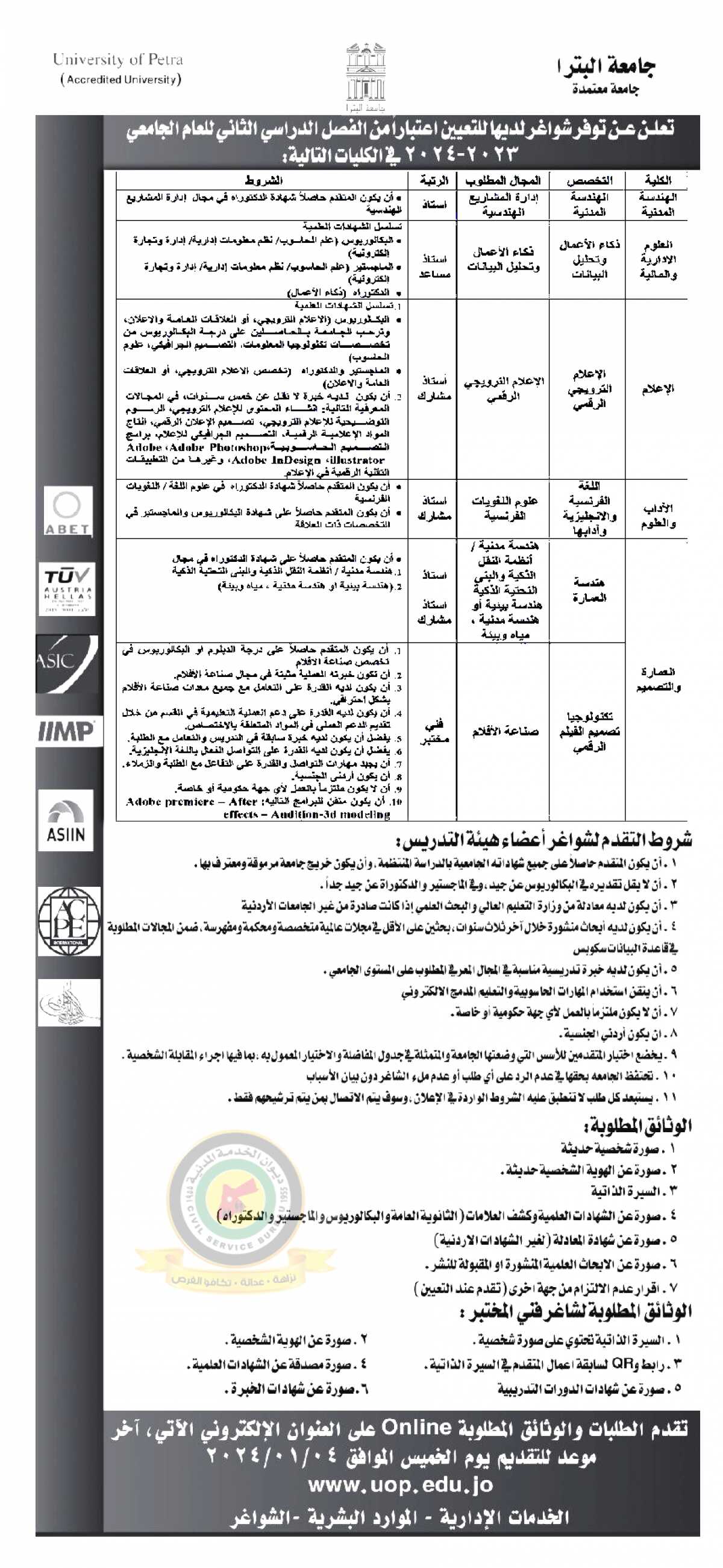 اعلان وظائف شاغرة صادرعن جامعة البترا