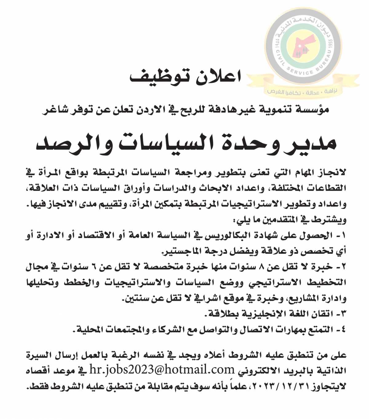 اعلان وظائف شاغرة مدير وحدة السياسات والرصد صادرعن مؤسسة تنموية غير هادفة للربح