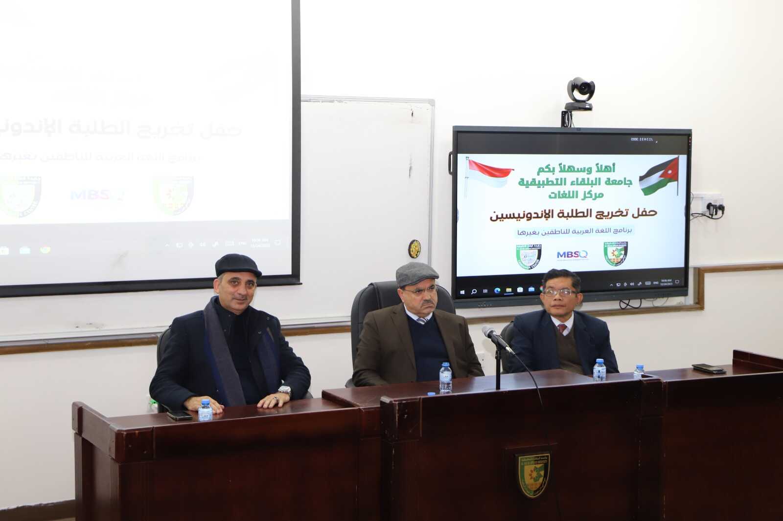 كما قدم الاستاذ الدكتور ابو عرابي التهنئة باسم جامعة البلقاء التطبيقية للطلبة الاندوسيين لاجتيازهم دورة تعلم اللغة العربية التي نظمها مركز اللغات في الجامعة مؤكدا ان الطلبة الاندونسيين يعكسون السمعة الطيبة والمستوى المتقدم عن جامعة البلقاء التطبيقية.