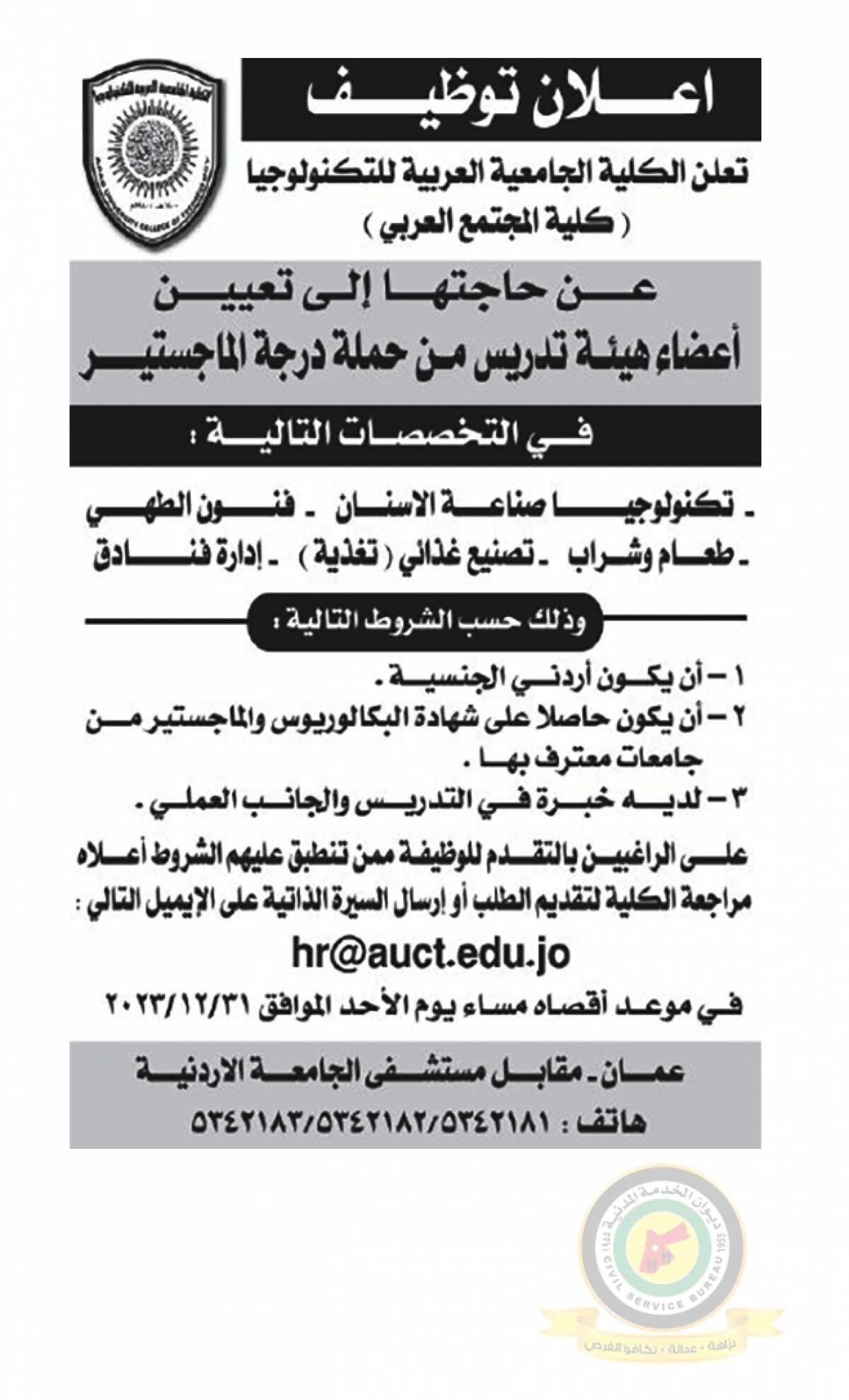 اعلان تعيين اعضاء هيئة تدريسية صادرعن الكلية الجامعية العربية للتكنولوجيا(كلية المجتمع العربي )