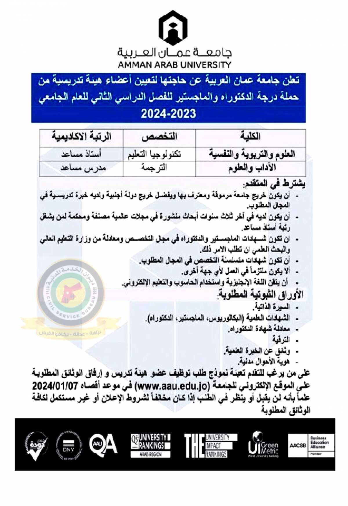 اعلان تعيين اعضاء هيئة تدريسية صادرعن جامعة عمان العربية