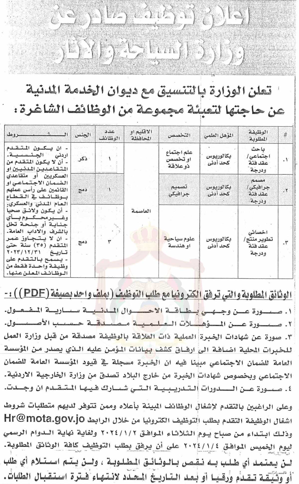 اعلان توفر وظائف شاغرة صادر عن وزارة السياحة والاثار