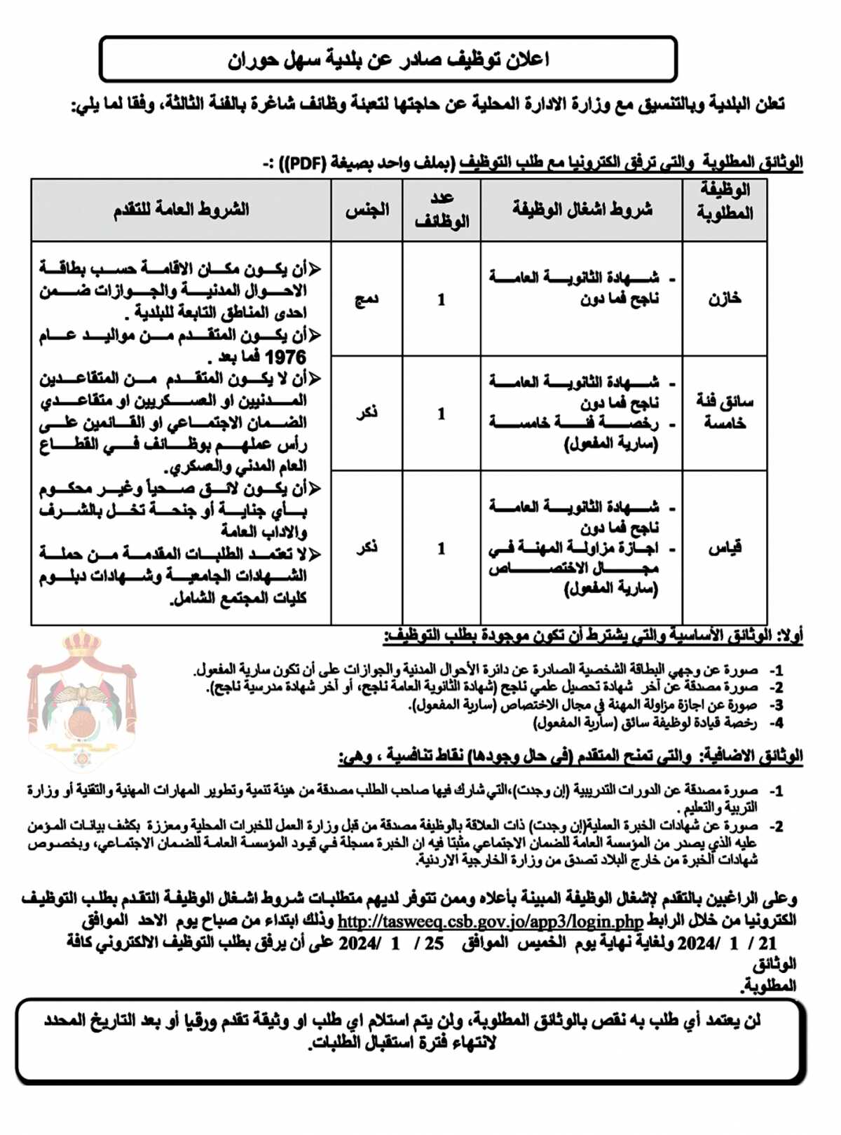 اعلان وظائف شاغرة بالفئة الثالثة صادرعن بلدية سهل حوران