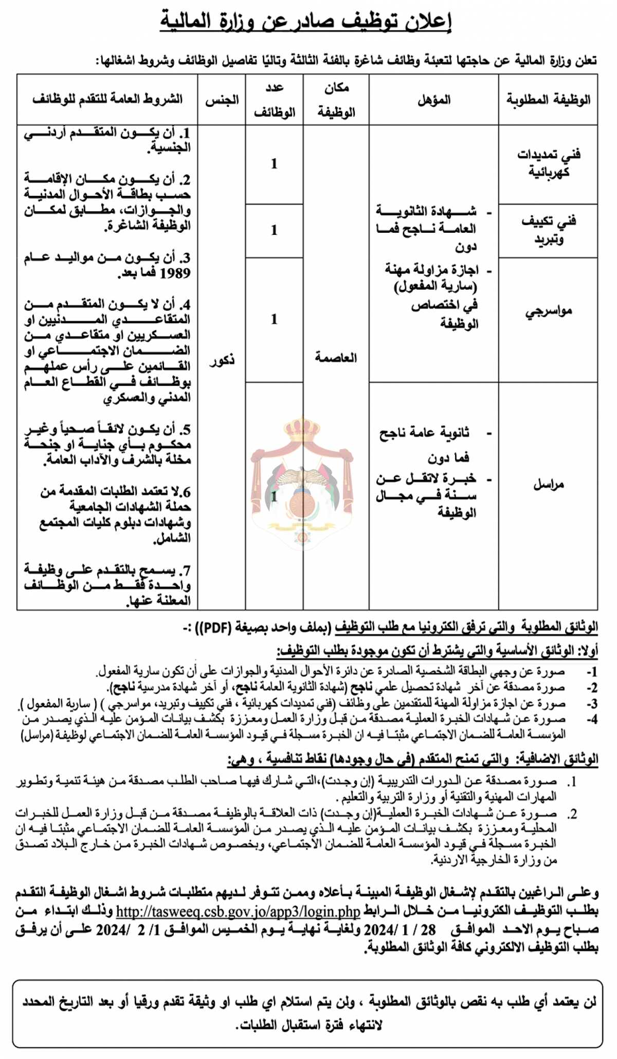 اعلان وظائف شاغرة بالفئة الثالثة صادرعن وزارة المالية