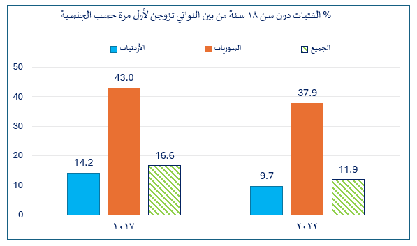 ودلّل المجلس على ذلك بما أظهرته الإحصاءات خلال السنوات الخمس الأخيرة؛ فبغض النظر عن الجنسية انخفضت هذه النسبة بحوالي 5 نقاط مئوية بين عام 2017 وعام 2022 من نحو 17 بالمئة إلى نحو 12 بالمئة، كما وحصل انخفاض مماثل بين اللاجئين السوريين خلال الفترة نفسها من 43 بالمئة إلى نحو 38 بالمئة، ولكن ما زال زواج اليافعات مرتفعاً جداً بينهم.