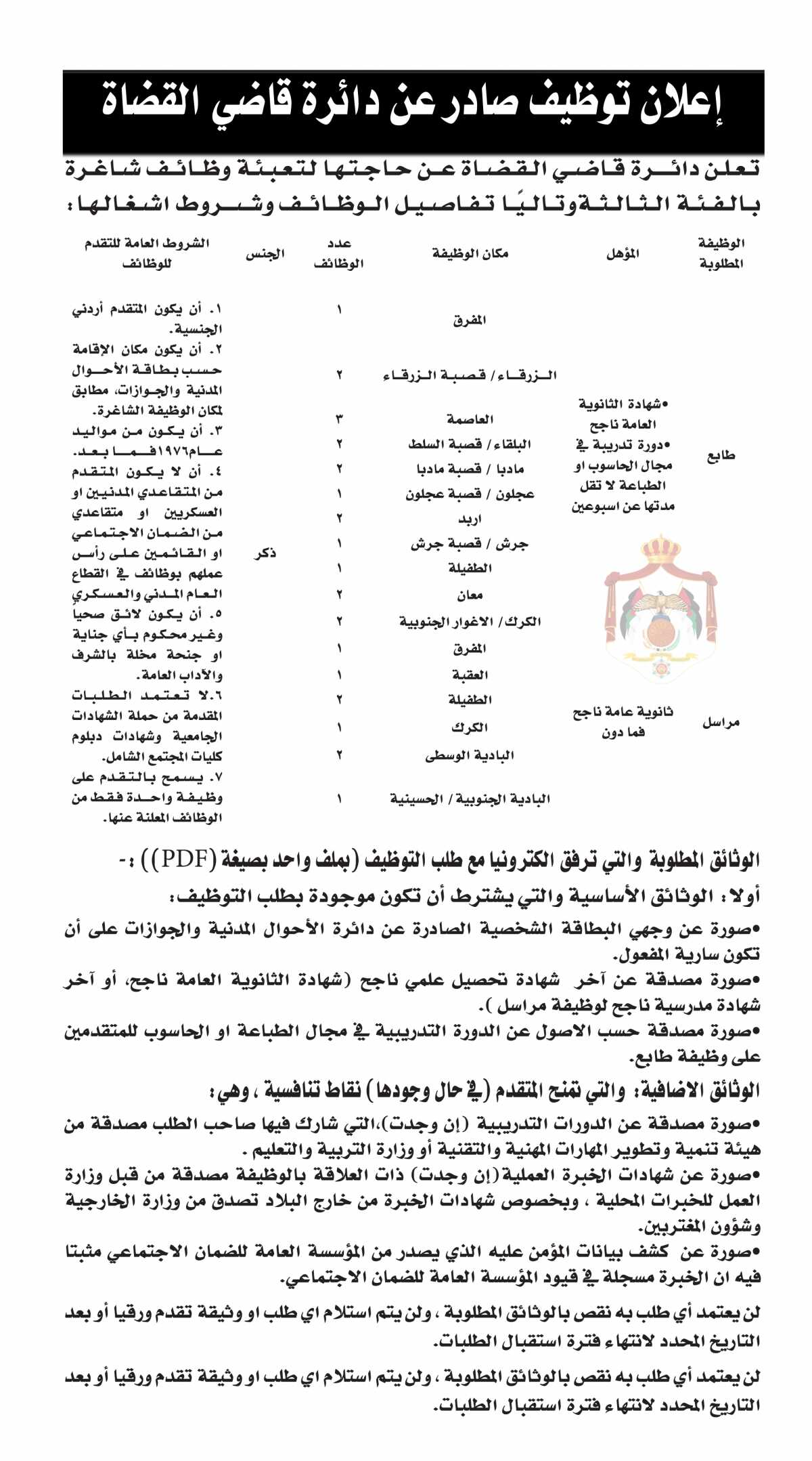 اعلان وظائف شاغرة بالفئة الثالثة صادرعن دائرة قاضي القضاة