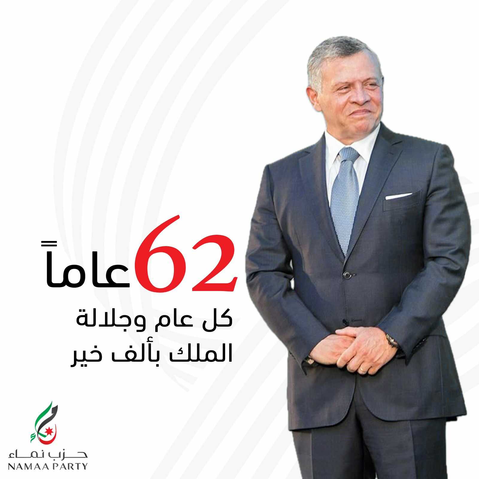 22 الاعلامي - أمين عام حزب نماء الدكتور محمد الرواشدة ، وكافة اعضاء الحزب ، يهنئون الحفيد الحادي والأربعين لسيدنا محمد، صلى الله عليه وسلم، صاحب الجلالة الملك عبد الله الثاني؛ الابن الأكبر للمغفور له بإذن الله جلالة الملك الحسين بن طلال، طيب الله ثراه، بعيد ميلاده الثاني والستون .