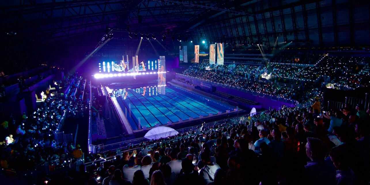بعد قيام فرقة موسيقية من الأطفال بأداء النشيد الوطني القطري، شدد الفنان القطري، عزام المناعي، المعروف بصوره الرائعة للقرش الحوتي الذي يعيش في المياه القطرية، على دور المياه في ربط العالم. وخلال مسيرة الرياضيين المشاركين، تم عرض أعلام بلادهم على حوض السباحة، كما رُفعت الأعلام البيضاء التي ترمز للسلام، وأُضيئت أساور الجمهور، مما أضفى رونقًا رائعًا على المدرجات، وعزز تجربة الحاضرين.