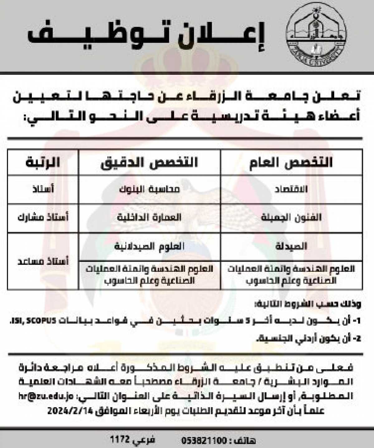 تعلن جامعة الزرقاء عن حاجتها لتعيين أعضاء هيئة تدريسية