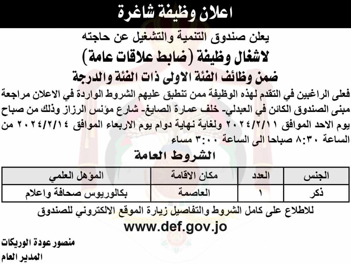 يعلن صندوق التنمية والتشغيل عن حاجته لإشغال وظيفة ضابط علاقات عامة