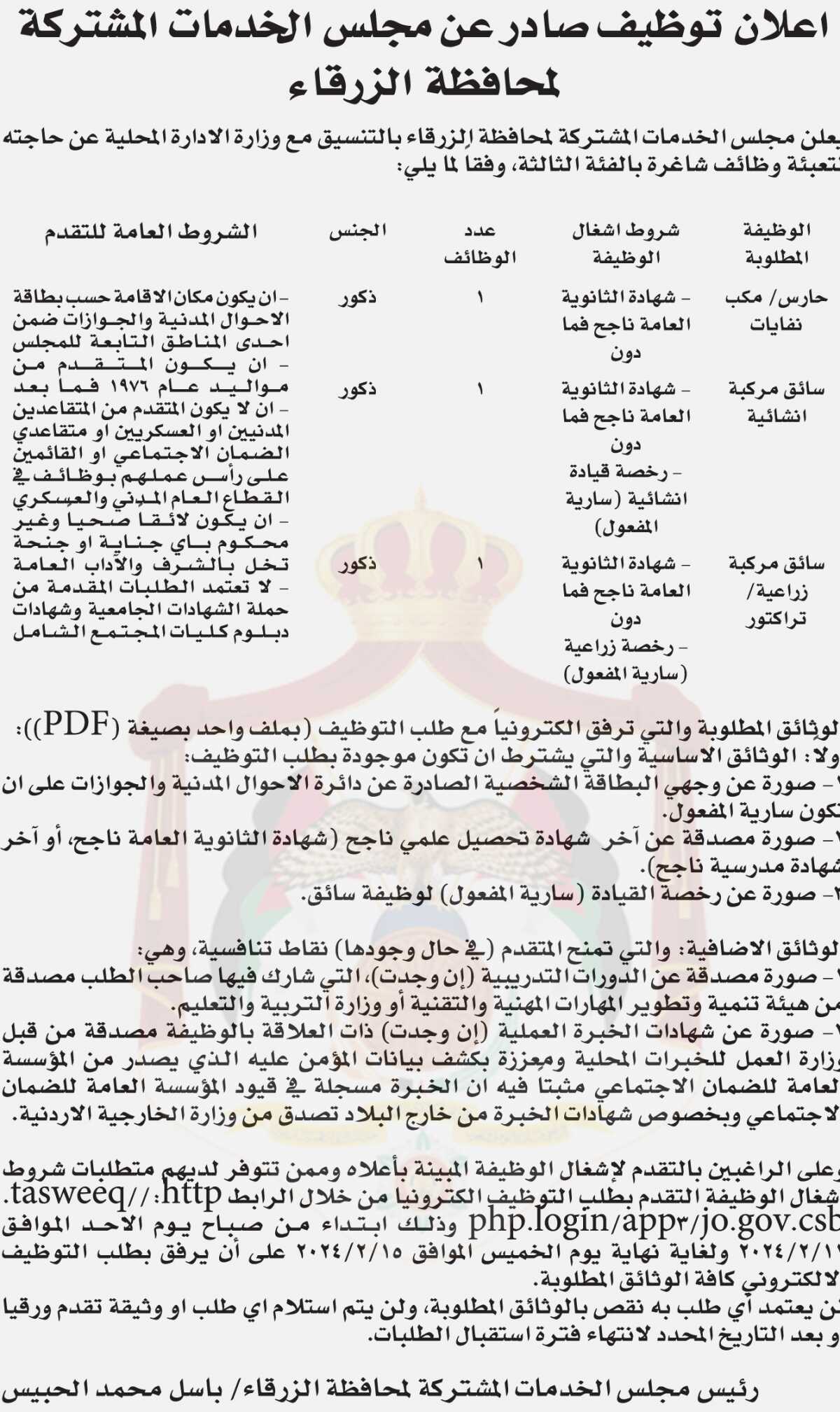 إعلان توظيف صادر عن مجلس الخدمات المشتركة لمحافظة الزرقاء