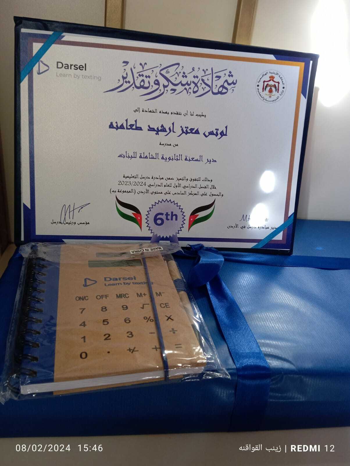 22 الاعلامي - ضمن إطار التميز والابداع، حققت الطالبة لوتس طعامنة من مدرسة دير السعنة الثانوية الشاملة للبنات المركز السادس على مستوى المملكة ضمن مبادرة درسل التعليمية للفصل الدراسي الأول 2023-2024.