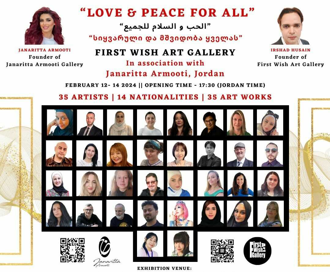 22 الاعلامي - تنظيم جالري جاناريتا العرموطي من الاردن و جالري فيرست ويش من جورجيا للتبادل الثقافي و بمشاركة فنانين من ١٤ دولة لتبادل الخبرات و الثاقافات و الفنون ببن الدول و نشرها حول العالم و التأكيد على دور الفن في توحيد العالم بلغة الالوان الموحدة للجميع و ذلك بحضور وزارة الثقافة و سفارة جورجيا وباقي السفارات للفنانين المشتركين