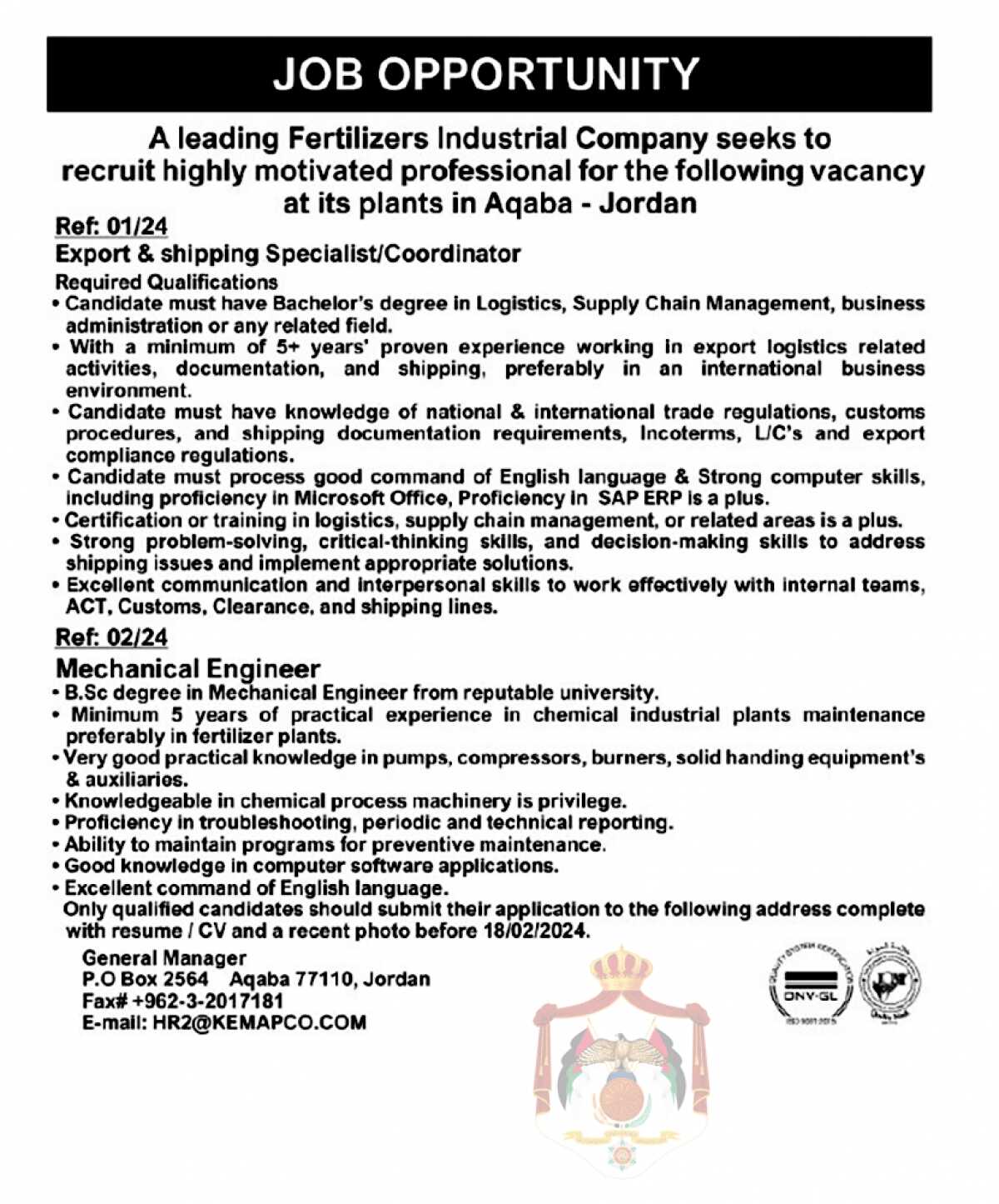 اعلان وظائف شاغرة صادرعن شركة رائدة في صناعة الاسمدة