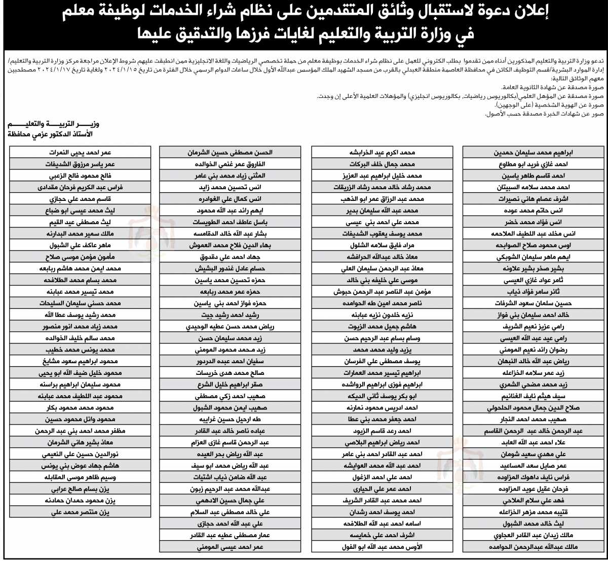 اعلان شراء خدمات لوظيفة معلم صادر عن وزارة التربية والتعليم