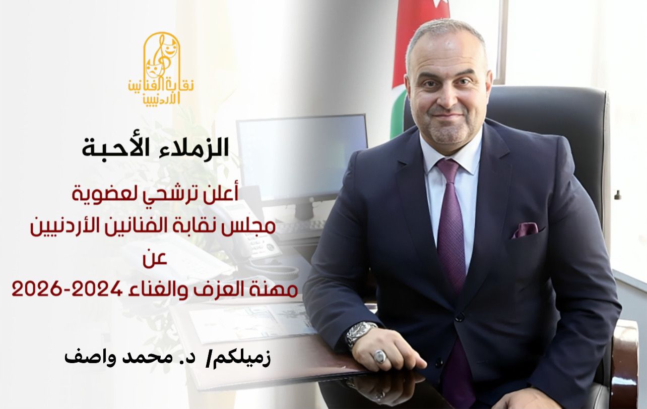 مع اقتراب موعد انتخابات نقابة الفنانين الأردنيين، وبعد حديث طال مع الأصدقاء والمقرّبين، أودُّ إعلان ترشّحي لعضوية مجلس نقابة الفنانين الأردنيين عن مهنة العزف والغناء، في الانتخابات المُقامة يوم الجمعة القادم 1/3/2024