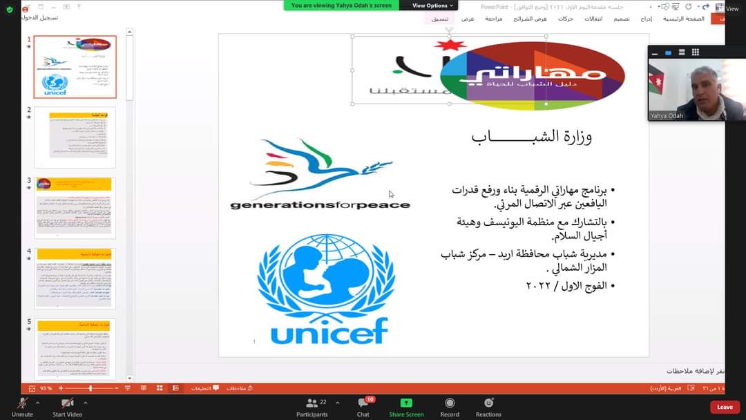 انطلق في مركز شباب المزار الشمالي فعاليات اليوم الاول من الفوج الأول من برنامج مهاراتي 2022 عبر تطبيق برنامج زوم والذي تنفذه وزارة الشباب بالشراكه مع اليونيسيف وهيئة أجيال السلام عبر تطبيق زووم بحضور 30 مشاركة للفئة العمريه من ١٥ ل ١٧ مع المدرب يحيى عوده ورئيس المركز عبدالرحمن العمري والذي سيستمر لمدة 6 ايام