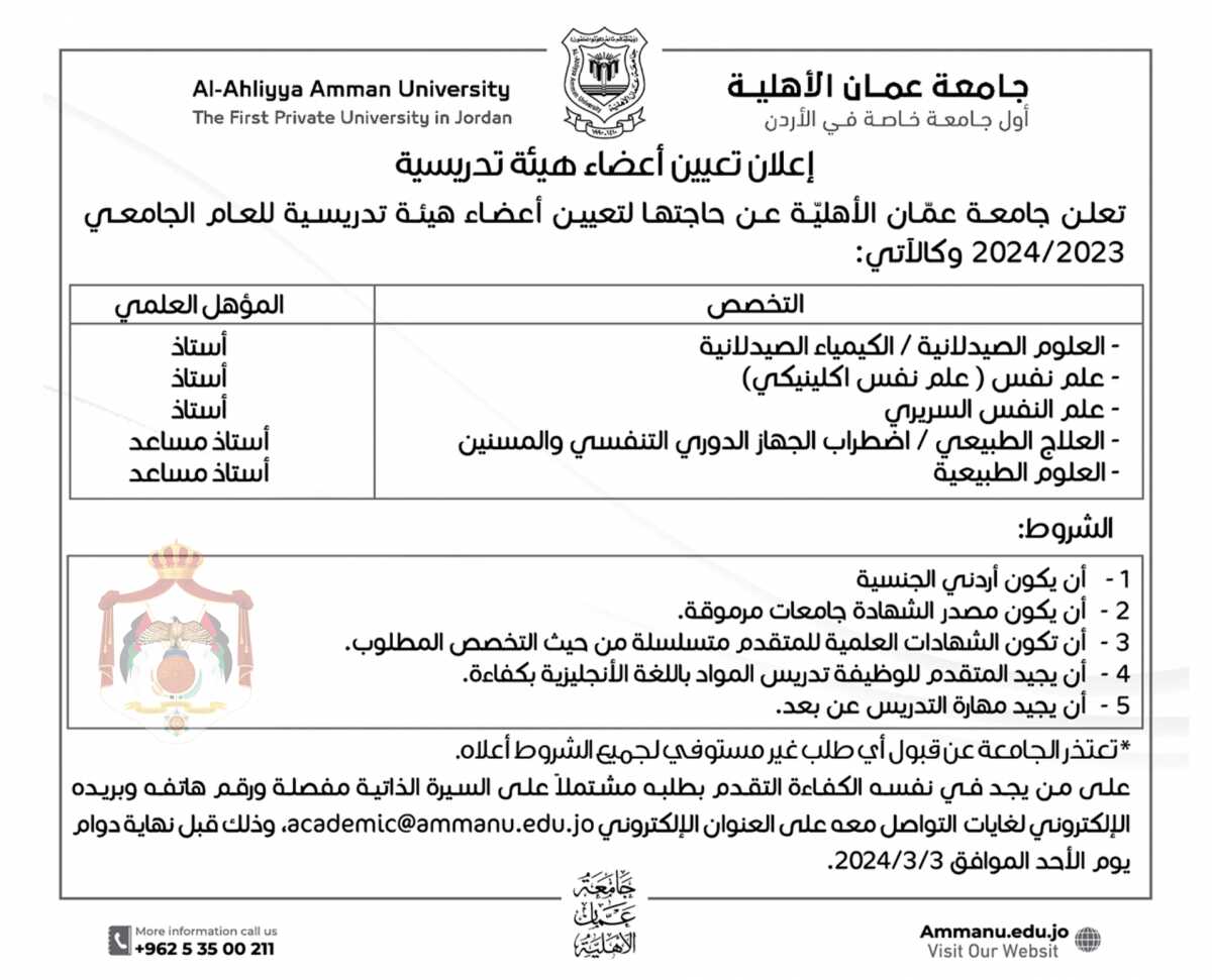 اعلان تعيين اعضاء هيئة تدريسية صادرعن جامعة عمان الأهلية