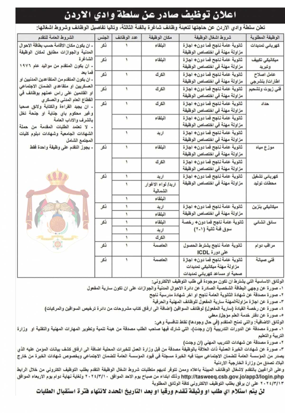 اعلان وظائف شاغرة بالفئة الثالثة صادرعن سلطة وادي الاردن