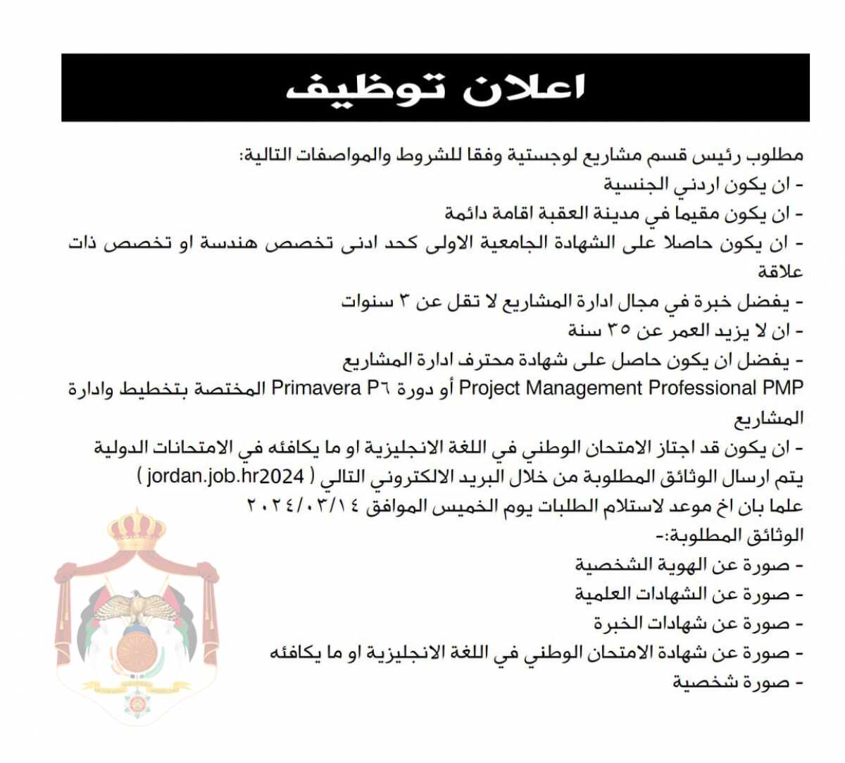 اعلان وظائف شاغرة رئيس قسم مشاريع لوجستية