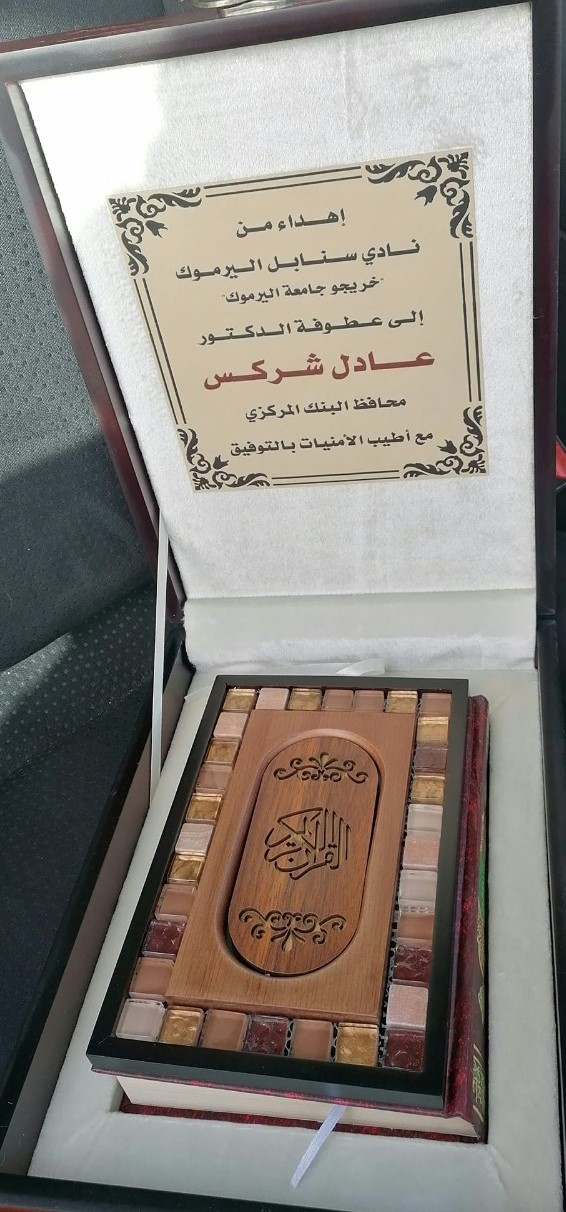 وفي نهاية اللقاء قدّم رئيس الوفد رئيس لجنة الموارد المالية في نادي السنابل د. مروان السميعات هدية تذكارية باسم النادي لمعالي محافظ البنك المركزي بصفته أحد خريجي اليرموك المتميزين، وتكون الوفد من السادة مروان السميعات وشادن حماد وميسون الخطيب وعبدالسلام الهنداوي ومحمد الخصاونه والاعلامي عامر الصمادي.