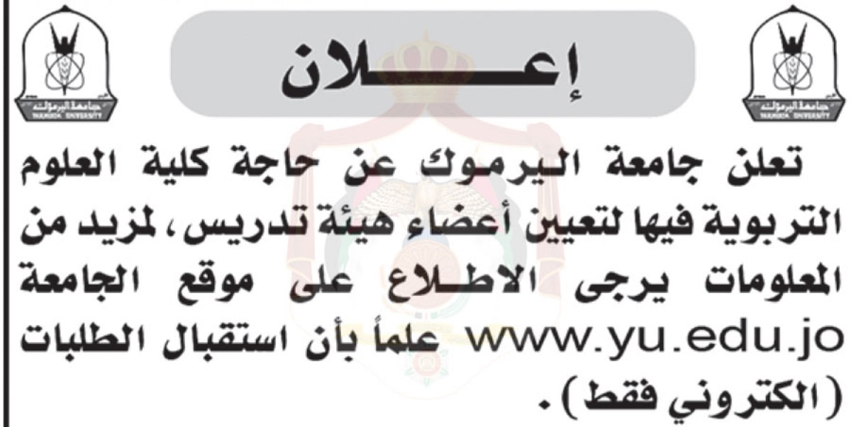 تعلن جامعة اليرموك لحاجة كلية العلوم التربوية لتعيين أعضاء هيئة تدريس