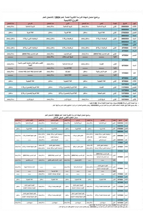 أعلنت وزارة التربية والتعليم اليوم الثلاثاء، جدول امتحان شهادة الدراسة الثانوية العامة لعام 2024 / الامتحان العام.