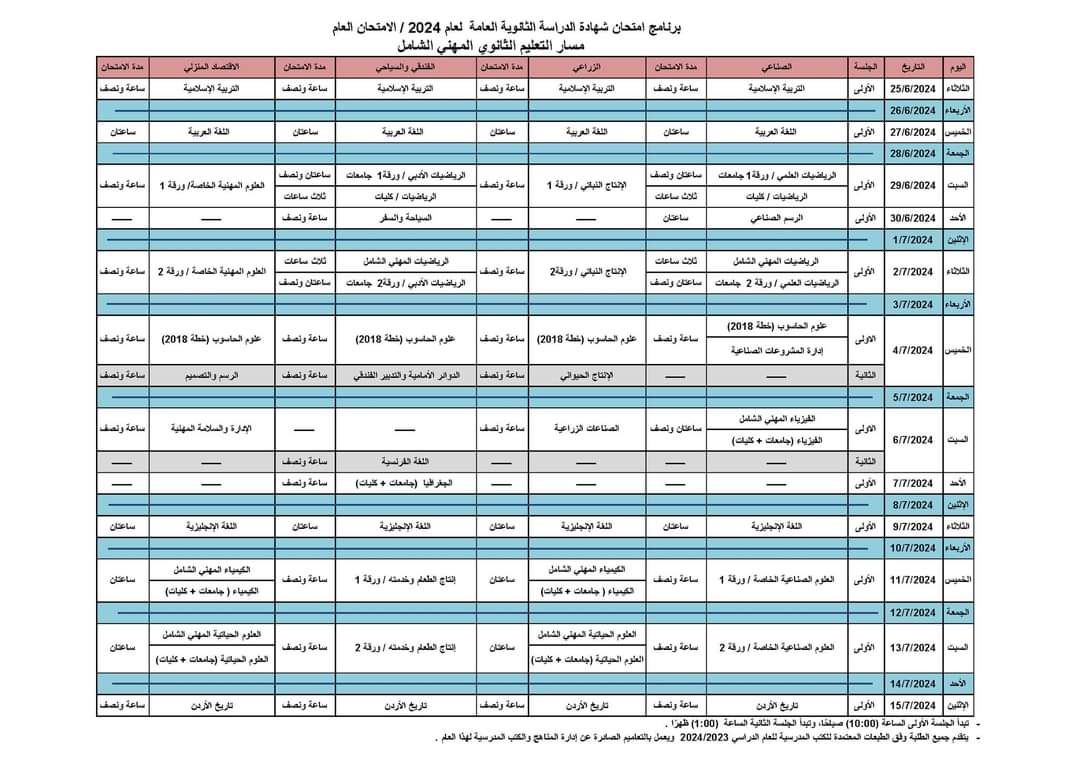 22 الاعلامي - أعلنت وزارة التربية والتعليم اليوم جدول امتحان شهادة الدراسة الثانوية العامة لعام 2024 / الامتحان العام.