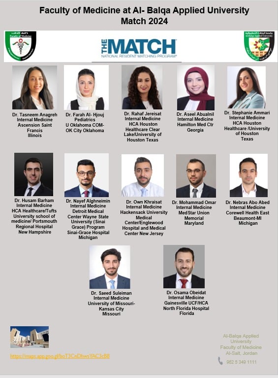 والتي تمكنهم من مواصلة الدراسة و التدريب للحصول على أعلى الدرجات العلمية ليعودوا بالنفع والفائدة على الوطن و المواطن ، مؤكدا ان هذا النجاح في الحصول على مقاعد في برامج الإقامة المختلفة في الولايات المتحدة الأمريكية في مستشفيات متميزة، جاء نتيجة تميز الخريجين معرفيا و مهاراتيا وتظافر الجهود بين إدارة الكلية وأعضاء الهيئة التدريسية و الطلبة وان هذا الإنجاز يعتبر مؤشرا جيدا على أننا نسير بخطوات متقدمة نحو العالمية خاصة في مجال الطب في جامعاتنا الوطنية ويؤكد على التنافسية العالية والمستوى الرفيع الذي وصل إليه طلبة كلية الطب وخريجوها في جامعة البلقاء التطبيقية.