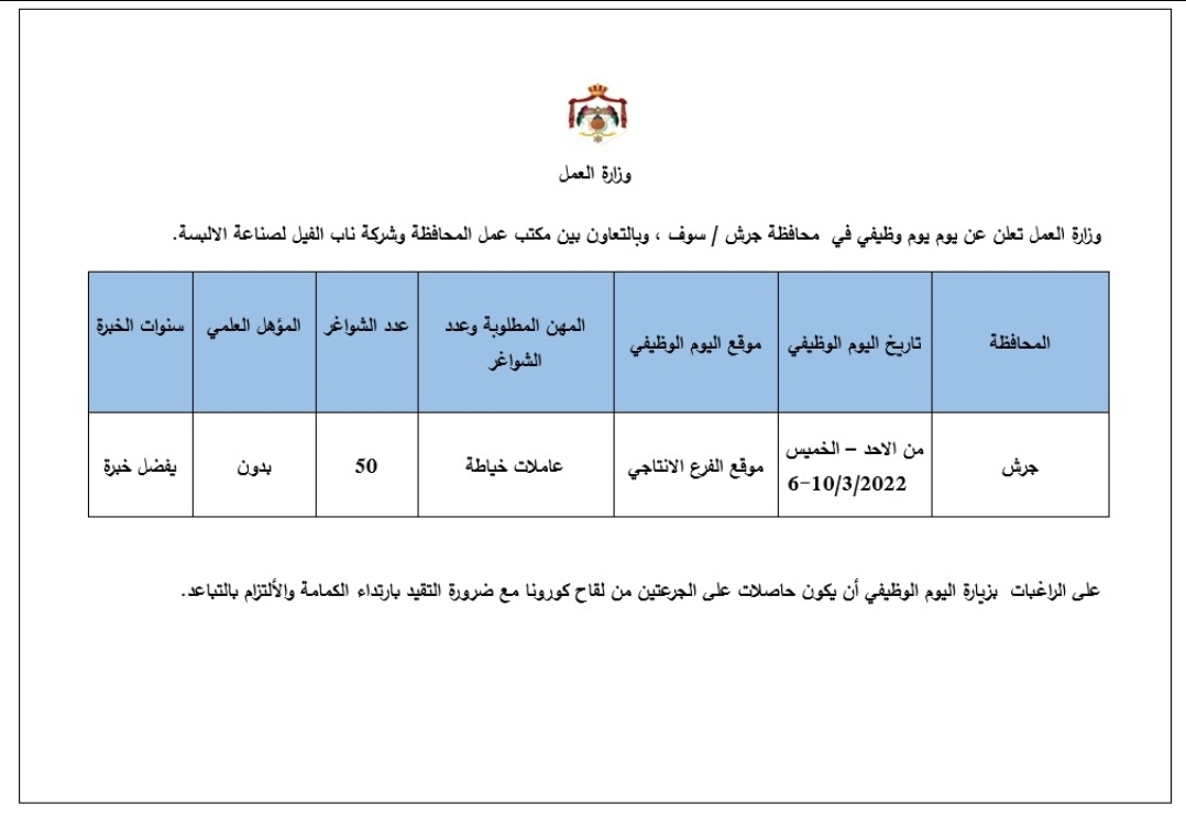 وفي إربد؛ أعلنت الوزارة عن توفر مئة شاغر لعاملات خياطة دون اشتراط خبرة أو مؤهل علمي، في الشونة الشمالية/ الزمالية بالتعاون بين مكتب عمل المحافظة وشركة الأزياء التقليدية لصناعة الألبسة.