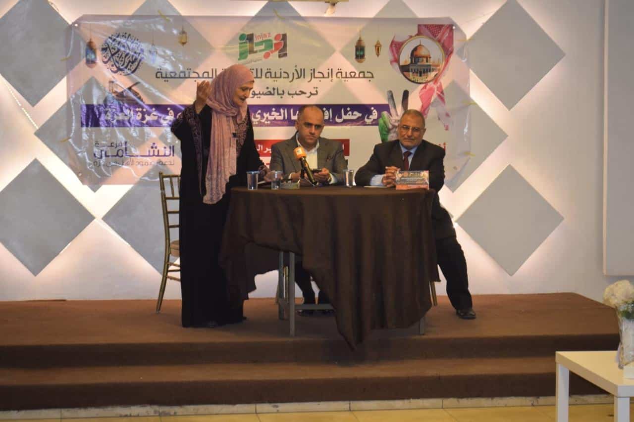 والتي أكد في كلمته على أهمية التكافل المجتمعي وشكر المشاركين والحضور، راجيا الله أن تكون صدقاتهم في موازين حسناتهم، واضاف أيضا أن لعل ما يميز هذه اللفتة الخيرية الكريمة دعم الأشقاء في غزة والتي هي المحور الرئيس لمأدبة الإفطار الخيري وقد عرض خلال الإفطار، موجز تفصيلي عن إنجازات اللجنة العليا المنظمة لنشاطات الجمعية ، كما أستعرض حجم إنجازات جمعية إنجاز الأردنية للتوعية المجتمعية ودعمها المتواصل للمشاريع والبرامج التوعوية التي تصب في خدمة المجتمع المحلي ونشاطاتها في أمسيات سنبقى صامون لدعم الصمود في غزة العزة والتي أقيمت في محافظة العاصمة ومحافظة العقبة بالتعاون مع الهيئة الخيرية الهاشمية.