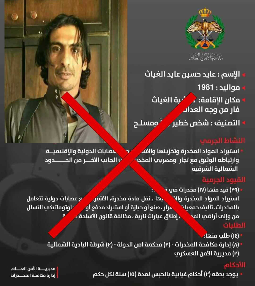وأكّد الناطق الإعلامي أنّ المداهمة جاءت بعد جهد عملياتي واستخباري جرى خلاله تحديد مكان وجود المطلوب ( عايد حسين عايد الغياث ) والمطلوب ب 14 طلبا بقضايا استيراد المواد المخدرة والاتجار بها والاشتراك مع عصابات دولية وإقليمية وتأليف جمعيات الأشرار وإطلاق عيارات نارية وضبط بحوزته سلاح ناري اوتوماتيكي وكمية من الذخيرة .