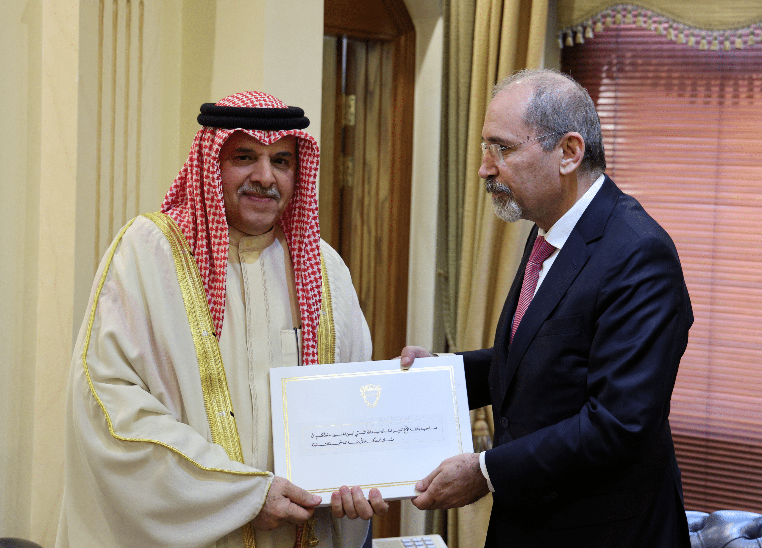 وتسلم رسالة الدعوة نائب رئيس الوزراء ووزير الخارجية وشؤون المغتربين أيمن الصفدي، من سفير مملكة البحرين الشيخ خليفة بن عبدالله آل خليفة، الذي نقل تحيات جلالة الملك حمد إلى جلالة الملك عبدالله الثاني.