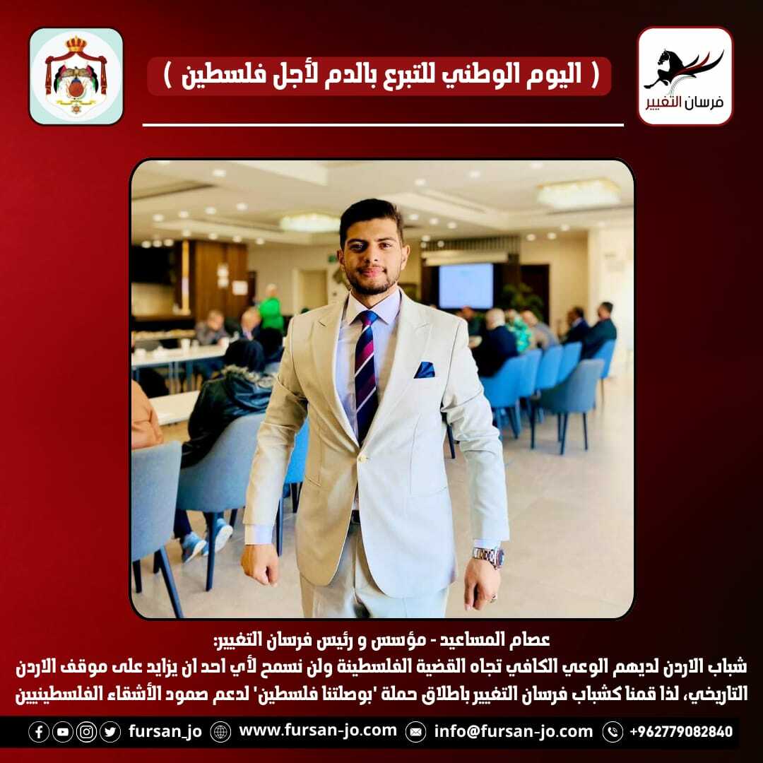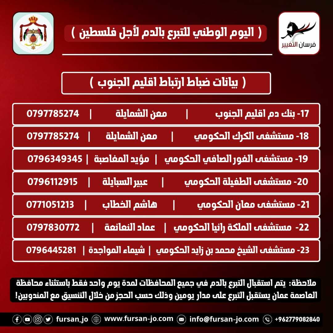 22 الاعلامي - تنظم جمعية فرسان التغيير للتنمية السياسية وتطوير المجتمع المدني يوم وطني للتبرع بالدم لأجل فلسطين تحت شعار (دمنا دمكم) برعاية كريمة من رئيس مجلس النواب الأردني السيد احمد الصفدي وبالتنسيق مع وزارة الصحة وبنك الدم الوطني والجامعات الأردنية والأحزاب الوطنية وعدد من مؤسسات المجتمع المدني والمحلي، للتسجيل وللمزيد من التفاصيل يرجى زيارة الرابط التالي: