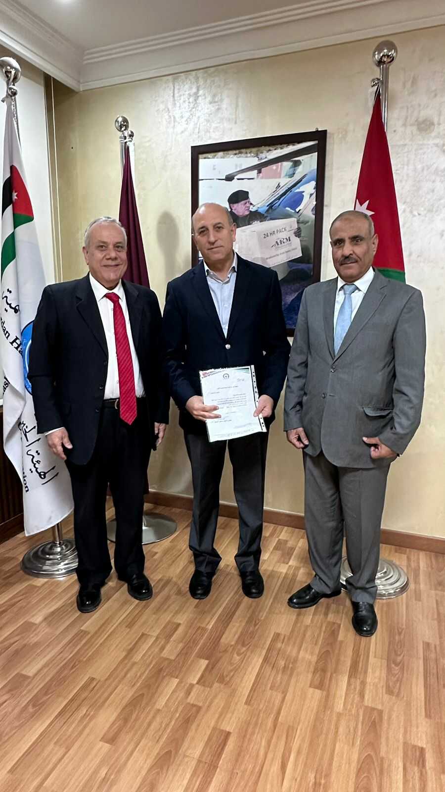 وقد قام بتسليم التبرع نائب الأمين العام الدكتور محمد باشا السرحان وعضو المكتب السياسي الدكتور حسام الشريدة.