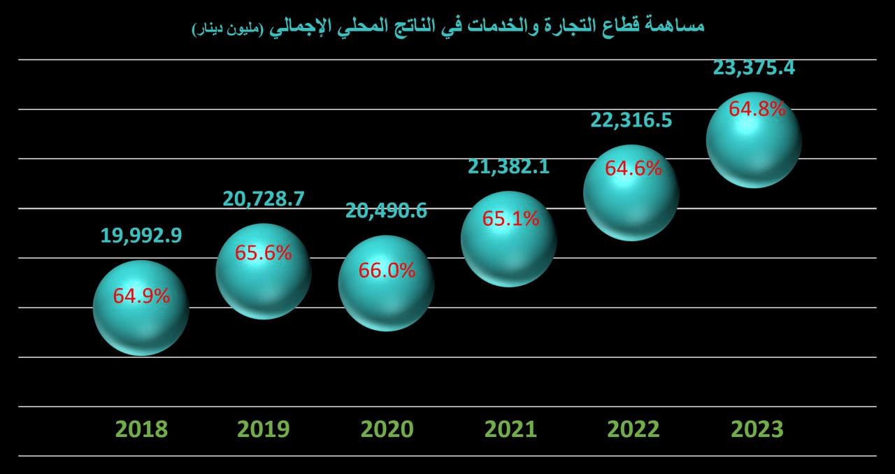 ولفت إلى أن مساهمة القطاع التجاري والخدمي في الناتج المحلي خلال السنوات الخمس الأخيرة، اتجهت بمسار تصاعدي من 19.993 مليار دينار عام 2018، إلى 23.375 مليار دينار العام الماضي 2023.